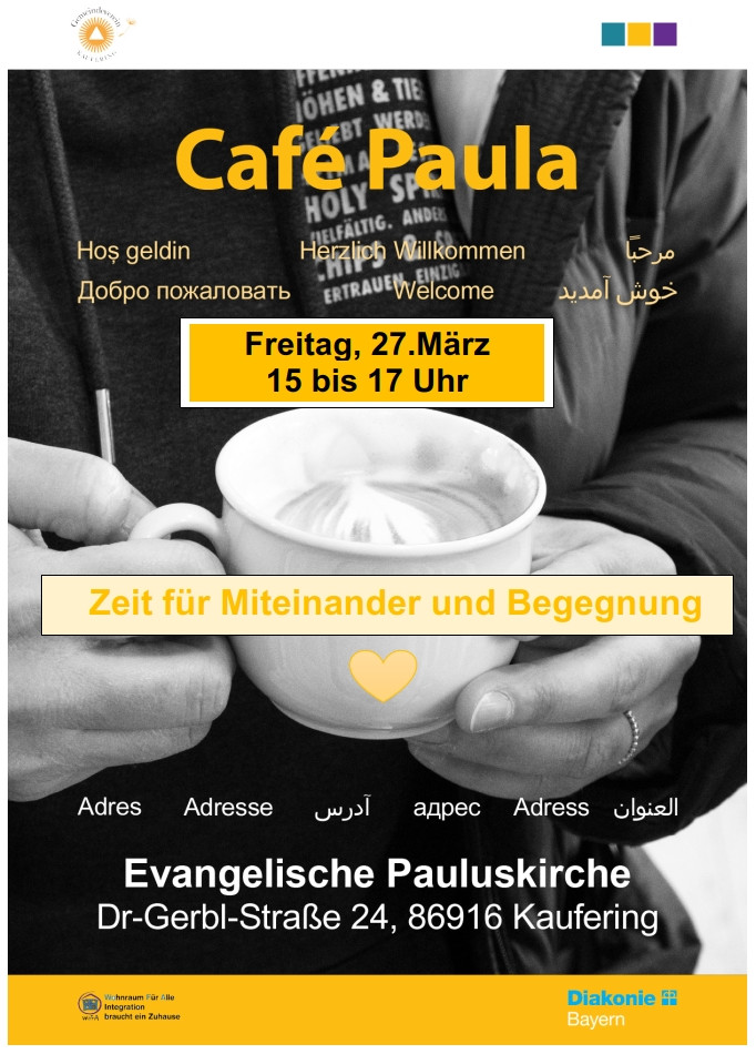 Am kommenden Freitag, dem 27. März ist es wieder soweit - zwischen 15 und 17 Uhr öffnen wir unsere Türen und verwandeln unseren Gemeindesaal in ein kleines Café. Und wir freuen uns sehr, wenn ihr mit dabei seid.